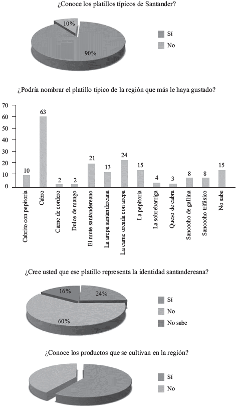 También se indagó por el platillo o alimento de la región que más les gustó. Al respecto, el cabrito fue el plato que obtuvo la mayor puntuación (63), seguido de la carne oreada (24), el mute (21), la pepitoria (15) y la arepa (13). Aquí no hubo ninguna sorpresa, porque son los platos más reconocidos de la cocina santandereana. Estas personas también respondieron a la pregunta "¿cree usted que este platillo representa la identidad santandereana?, interrogante al que el 60 % respondió que sí, el 24 % señaló que no y el 16 % indicó que no sabe. Estas preguntas y respuestas vienen a confirmar que la gastronomía, comprendida desde una concepción general, puede ser vista como una generadora de identidades, porque ella impacta los componentes culturales de una determinada comunidad y genera elementos que permiten distinguirla de otra al asociar sus costumbres, clima y medio ambiente con aspectos de la producción agrícola, la preparación de los alimentos y sus hábitos alimentarios, y también en su relación con aspectos sociológicos, históricos, filosóficos y antropológicos de cada región. Por ello, los encuestados en su mayoría respondieron afirmativamente a la siguiente pregunta: ¿Le gustaría conocer el proceso de cultivo y recolección del producto que se da en la zona?, pues el 67 % señaló estar interesado, mientras que un 33 % indicó que no.