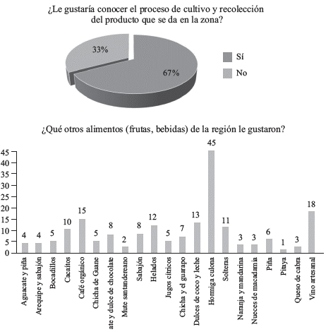 En las dos últimas preguntas de la encuesta se quiso indagar acerca de cuál otro alimento (bebida, frutos, dulces) de la región les gustó. Aquí la respuesta más numerosa la obtuvo la "hormiga culona" (45), otro producto de gran reconocimiento de la identidad del santandereano. En cuanto a los productos que serían integrados a la ruta, los encuestados también nombraron en sus respuestas varios de ellos. Obviamente, estas respuestas fueron dadas por visitantes encuestados en el lugar de producción de estos alimentos. Así, se tiene que el vino artesanal de Zapatoca fue mencionado por 18 personas como ese otro alimento o bebida que más les gustó de la región; el Café Orgánico Mesa de los Santos obtuvo 15 señalamientos; los helados de Villanueva fueron nombrados por 12 personas; y la chicha de Guane fue el otro alimento que les gustó a 5 visitantes.