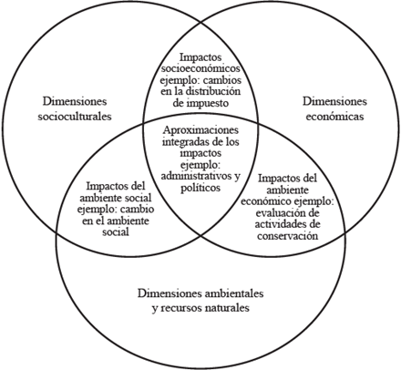 En dicha ilustración, el autor identifica y clasifica los impactos de acuerdo con su origen y establece tres dimensiones: económica, ambiental y sociocultural. Así mismo, resalta las relaciones entre cada tipo de impacto y detalla que estos pueden pertenecer a dos o tres dimensiones, lo que complejiza clasificar los impactos en un solo campo.