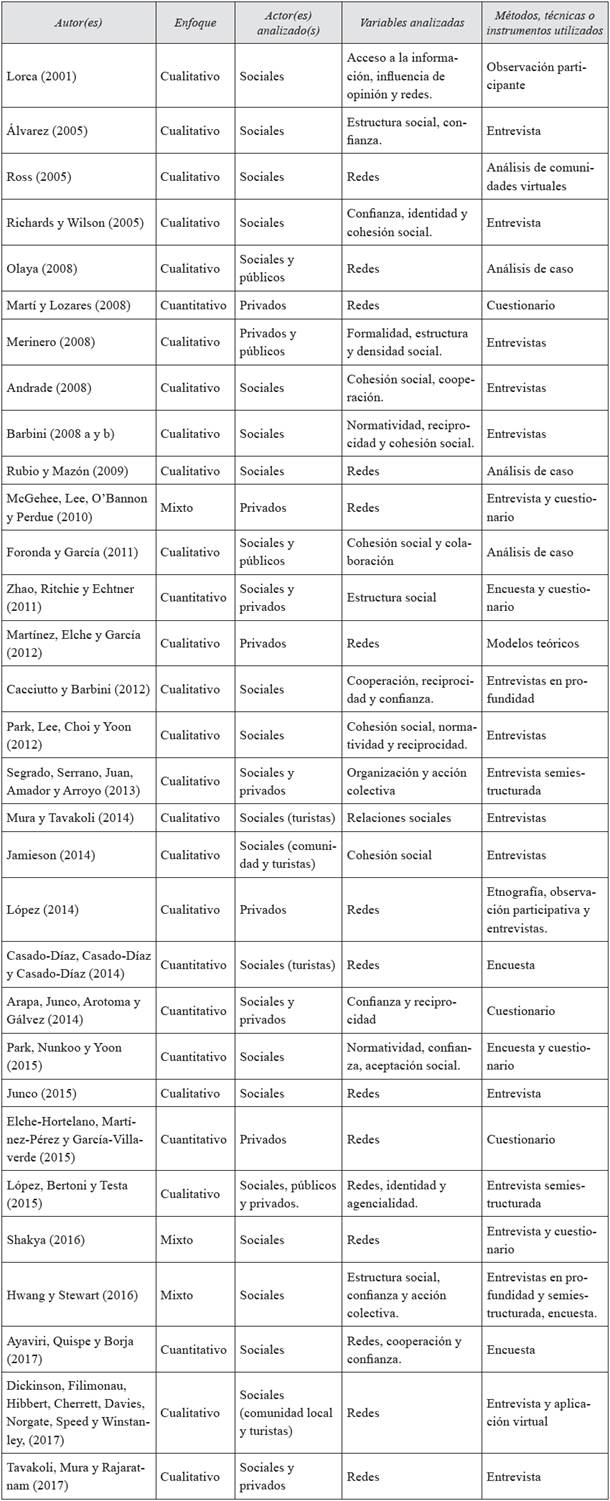 La tabla 1 expone las principales aproximaciones metodológicas en las investigaciones sobre turismo y capital social.