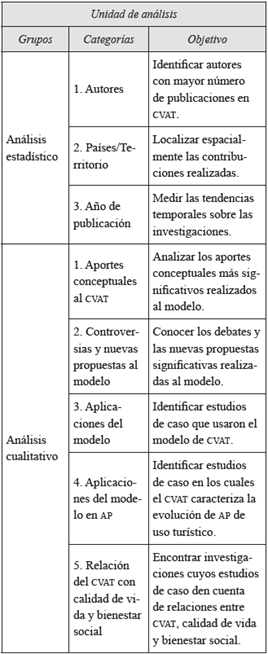 Las investigaciones realizadas sobre el CVAT como instrumento para caracterizar y conocer la evolución de un destino permiten comprender la dinámica del turismo y su inserción en el mercado global, con el propósito de llevar a cabo la implementación de estrategias competitivas que ayuden al desarrollo del destino y a visibilizar los efectos socioeconómicos, culturales y ambientales de este en el territorio. Esta generación de conocimiento también es fundamental para la toma de decisiones, el diagnóstico, la planificación turística y para fortalecer futuros estudios que analicen las relaciones e implicaciones de lo que ocurre en cada una de las etapas de la evolución de los destinos turísticos y su población de acogida. Por lo tanto, es objetivo de este estudio revisar las publicaciones sobre este tema con bases de datos reconocidas, para exponer las críticas y los enfoques abordados desde un marco conceptual del CVAT, su aplicación en AP y su relación con la calidad de vida y el bienestar social de la población receptora. Esta revisión tiene objetivos específicos acordes con los grupos y las categorías de análisis presentados en la tabla 1.