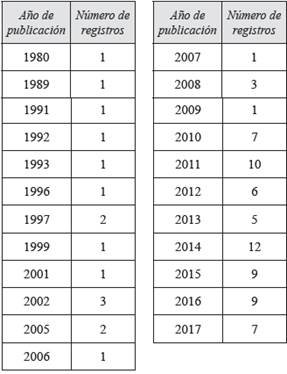 En la tabla 4 se aprecia una tendencia pobre de publicaciones en las dos primeras décadas, inclusive ausencia en algunos casos. Se evidencia que la mayor concentración de publicaciones sobre CVAT ocurrió en el período 2010-2017, con el punto más alto en los años 2011 y 2014. De esta situación se pueden hacer dos interpretaciones: la primera, como un caso fortuito de publicaciones, en la mayoría de los casos, de estudios empíricos; la segunda, como un acontecimiento que coincidió con la segunda edición de la publicación de "The origins of the tourism area life cycle" (Butler, 2011a), en la que se aclaran algunos puntos teóricos y percepciones erróneas que se presentaban en el modelo.
