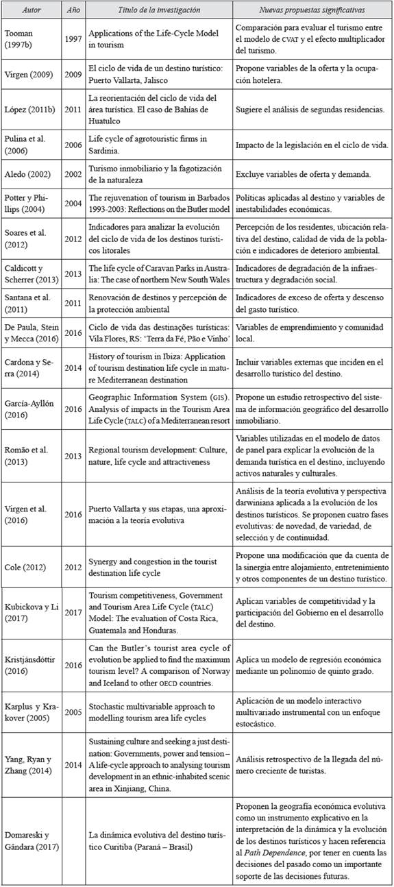 Acerca de las nuevas propuestas, tres décadas después el mismo Butler examina el origen del modelo de CVAT, su utilización temprana, sus críticas y modificaciones y su relevancia actual en la investigación del turismo, y alude a los vacíos teóricos y a las debilidades del modelo. En la tabla 5 se reflejan de manera concreta las nuevas propuestas significativas que se encontraron en las investigaciones. Indiscutiblemente, cada uno de los estudios aquí descritos evidencia necesidades de análisis diferentes, inclusión de nuevos elementos -como percepción de residentes, indicadores de degradación, indicadores de gasto turístico, competitividad y hasta modelos de regresión económica, entre otros- que no se incluyeron en la propuesta inicial, que se podrían llamar variables acomodadas a cada uno de los destinos y necesidades. Esto hace reconocer que cada destino tiene características diferentes, que su desarrollo se da en espacios geográficos y temporalidades disímiles y que cada uno de ellos sugiere la inclusión de variables acordes a esas características.