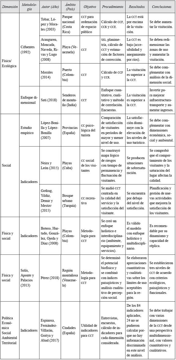 En esta revisión se comprobó que una de las metodologías más utilizadas en las dimensiones física y ecológica es la de Cifuentes (1992) (ver tabla 1). Su profusa difusión se debe a su sencillez y capacidad de adaptación a las características particulares de cada destino. Se ha utilizado para una diversidad de áreas naturales, así como para infraestructuras urbanas.