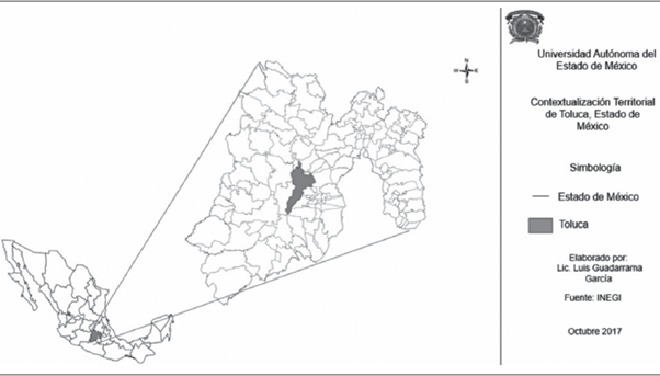 El municipio de Toluca se ubica en las coordenadas geográficas extremas 10°04' y 19°28' de latitud norte, así como 99°31'43" y 99°47' de longitud oeste del meridiano de Greenwich (ver figura 1). La altura promedio es de 2.660 m s. n. m. Cuenta con una superficie de 42.952,14 ha y con una población de 819.561 habitantes, que representa 5,40 % del total del Estado de México.