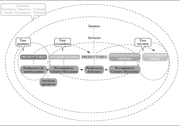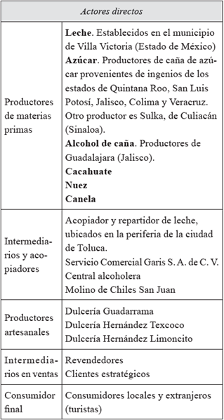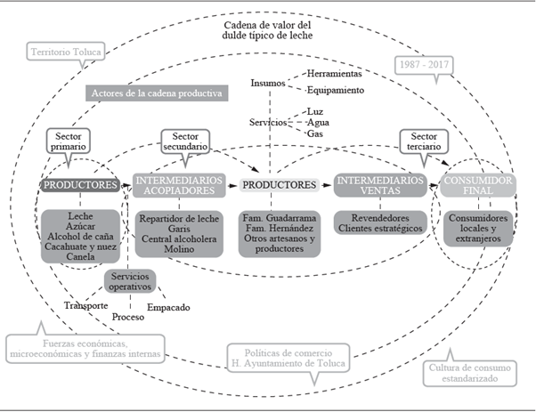Ahora bien, si en la valorización del dulce típico de leche están inmersos los elementos tangibles e intangibles que encierra su elaboración, y el territorio es considerado en esa producción, entonces puede considerarse que el dulce de leche del municipio de Toluca (Estado de México) pertenece a una cadena de producción. Jansen y Torero (2007, p. 24) definen la cadena de producción como "el conjunto de agentes económicos que participan directamente en la producción, después en la transformación y en el traslado hasta el mercado de realización de un mismo producto". Para Van Der Heyden y Camacho (2006) es una "cadena productiva de un sistema constituido por actores interrelacionados y por una sucesión de operaciones de producción, transformación y comercialización de un producto o grupo de productos en un entorno determinado".