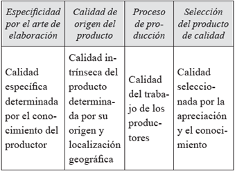 Como se muestra en la tabla 1, el producto no es solo como lo encuentra el consumidor final: su trasfondo y su contexto son muy importantes. En el ejemplo de la tabla 1 se valoriza la calidad, para lo cual se consideran los rasgos específicos del producto que le otorgan una identidad propia en un territorio específico y que lo hacen único al compararlo con otros productos. Por su parte, González-Laxe (2006) evalúa la calidad con respecto a su tipología, y para ello considera parámetros como la especificidad por el arte de la elaboración, la calidad de origen del producto, el proceso de producción y la selección del producto de calidad ex-post.