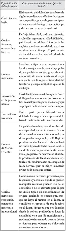 La gastronomía es un nuevo campo de estudio que, si bien tiene una larga historia, los conceptos que encierra esta actividad aún se están construyendo. Tal es el caso del dulce típico de leche, el cual, como se mostró en párrafos anteriores, tiene un antecedente histórico, pero es escasa la información conceptual de lo que es, por lo que, para poder obtener una definición de este, se realizaron entrevistas semiestructuradas a profesionales de la gastronomía, de las cuales se desprendió la siguiente información (tabla 2).