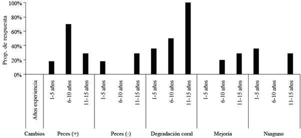 En la figura 10 se observa el análisis de las respuestas en función de los años de experiencia de los tripulantes, donde se destaca el hecho de que todos los guías y pilotos más veteranos perciben la degradación del ecosistema del sendero. Cuanto más reciente su vinculación, con menor frecuencia perciben el cambio negativo. El cambio comportamental de los peces es notado por quienes tienen más de 6 años en la actividad (70 %), y solo alrededor del 20 % de los guías más recientes lo mencionan. Llama la atención cómo la mejoría en el sitio solamente es nombrada por los acompañantes de 6 años en adelante, con un máximo de 18 % de los más veteranos.