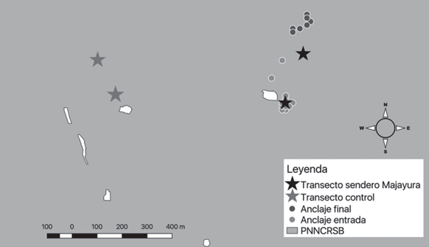 Para el desarrollo de esta investigación, el trabajo de campo se realizó entre el 12 de julio y el 20 de agosto de 2017, y tomó lugar en el sendero de Majayura, ubicado al costado norte o barlovento del archipiélago del Rosario, en el PNNCRSB, sendero dedicado predominantemente a la actividad de snorkelling en la modalidad de pasadía, y el cual se muestra en la figura 2. En esta misma figura se aprecia el sitio de control, un punto cercano sin presencia histórica de actividades de turismo submarino, según afirmaron habitantes de la zona y trabajadores del Oceanario consultados. La estructura geomorfológica y las profundidades de ambos sitios son similares. En cuanto a la pesca en el sitio de control, los pescadores afirmaron no frecuentarlo debido a las mismas razones por las que no se visita el sendero, es decir, escasez de peces de interés y langostas.