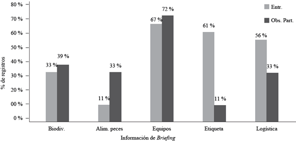 En este caso, se constató que en la mayoría de las embarcaciones se dieron briefings, contrario a lo hallado por Castro y pereira (2016) para la misma zona. En cuanto al contenido de los briefings observado y percibido por los guías, ilustrado en la figura 3, la mayor parte incluyó recomendaciones de uso del equipo y logísticas, lo cual es similar a lo hallado por Wiener et al. (2009) en Hawaii. En cambio, recomendaciones de comportamiento y manejo para el snorkelling se observaron con menor frecuencia de lo reportado en las entrevistas, lo que refleja tanto una necesidad de fortalecer este componente en el discurso como una incongruencia con lo percibido por los tripulantes.