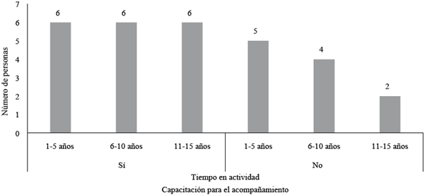 Por otro lado, sobre la formación para el acompañamiento de la actividad, 18 personas afirmaron haber recibido capacitación a lo largo de su trayectoria por parte de diferentes instituciones: PNN, Sena (servicio Nacional de Aprendizaje), Guardacostas u Oceanario de las Islas del Rosario. Entre los temas que recuerdan están biología de corales y recomendaciones para la protección de corales: "Y a cada uno nos decían que no, ¿qué clase de coral es este? ¿Cómo se llama el pez? Todo eso... [...] Por eso es que [sic] debemos cuidar los corales... No dejar que buceen con [aletas] [...]" (Guía 7, 30 años). Las respuestas indican asimismo que el tiempo desde la última capacitación lo consideran demasiado largo: "Hace rato... Ponle dos años, que debieran hacerlo más frecuente" (John Medina, guía, 44 años). Entre los que afirmaron no haber recibido capacitación, algunos dijeron no creer que les corresponda recibirla, por su rol en la embarcación: