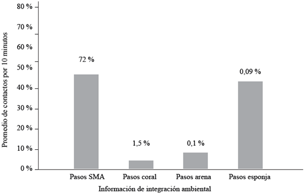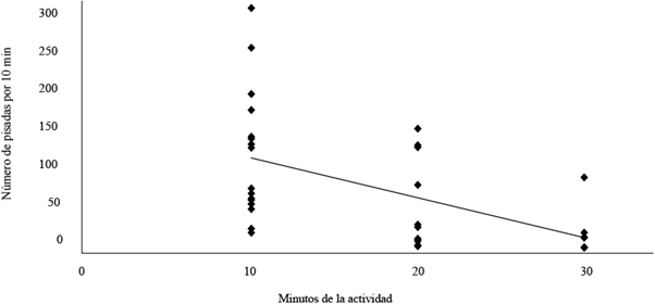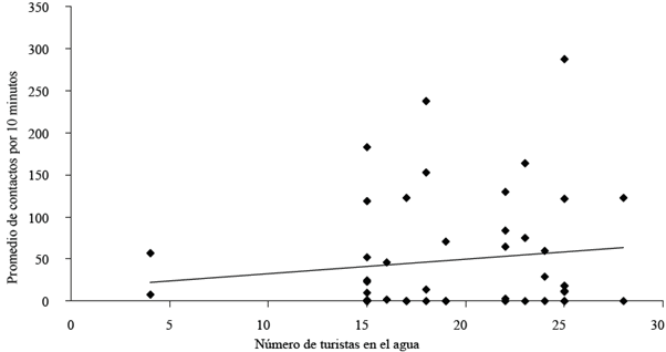 Se contabilizaron en promedio 18 turistas (desv. est. +/- 5) por embarcación en el agua haciendo la actividad de snorkelling, lo que equivale a un 49 % promedio de visitantes (desv. est. 16 %). Durante las observaciones, solo en dos casos los guías tenían aletas, mientras que ninguno de los turistas usó este equipo, solamente snorkel y máscara. Se registró el comportamiento de 49 turistas de 18 diferentes embarcaciones con base en las capacidades de observación simultánea de los investigadores, 16 de los cuales no tocaron los fondos (33 %), mientras que el resto presentaron contacto por lo menos una vez con el sustrato. Los contactos fueron, en su mayoría, pasos (promedio de contactos en 10 minutos ± desviación estándar: 74±72), y en menor proporción, contactos con la mano (0,54±1,9). Como muestra la figura 6, los pasos se registraron principalmente sobre sustrato muerto (72±71 pasos/10 minutos), seguido por corales (1,6±1,9 pasos/10 minutos), arena (0,15±0,6 pasos/10 minutos) y, en último lugar, esponjas (0,15±0,6 pasos/10 minutos). En promedio, se realizaron 4,9 pasos por minuto y 5,01 contactos (mano o pie) por minuto. Tal como lo indica la figura 7, la frecuencia de pasos fue mayor en los primeros diez minutos de la actividad, cuando los turistas entraron al agua (R2 ajustado: 0,35; P< 0,0001), entonces se encontró la menor profundidad (aunque la profundidad del sendero estuvo entre 1,20 y 3 m). Finalmente, no se halló una relación significativa entre el número de turistas en el agua y el promedio de los contactos de los turistas (R3 ajustado= 0,06; P= 0,41), de modo que la densidad por sí sola no influye en los contactos de los turistas individualmente sobre el sustrato, como lo muestra la figura 8.