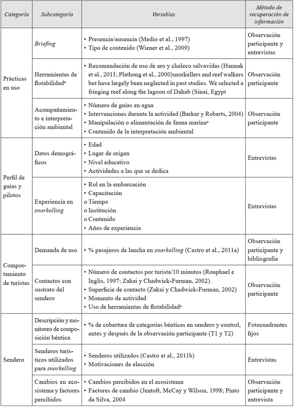 En la tabla 1 se muestran las categorías utilizadas durante la observación participante: se registró el número de contactos de los turistas con el fondo del sendero, el sustrato de contacto, con qué parte del cuerpo se tocaba, el momento de la actividad en que se observó (inicio, mitad o final), si usaban chaleco salvavidas y si estaban sujetos al aro salvavidas. Para ello, se eligieron aleatoriamente turistas de cada embarcación, quienes fueron observados durante diez minutos sin notificación previa (Rouphael e Inglis, 1997; Zakai y Chadwick-Furman, 2002). Por cada embarcación se observaron alrededor de tres turistas, sin mayor discriminación de rasgos, dado que el centro de esta investigación eran las prácticas de los tripulantes durante la actividad, más que los atributos de los turistas.