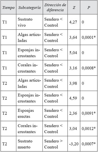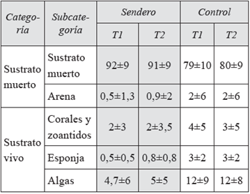 Por otro lado, en la tabla 3 (T2) se puede apreciar la comparación de los lugares después de la observación de las actividades turísticas, donde, a las diferencias iniciales (T1) se suman las algas costrosas, las esponjas erectas y el sustrato muerto. Las primeras dos tuvieron mayor cobertura en el sitio de control, y el sustrato muerto fue más abundante en el sendero, como se muestra en la tabla 4 (T2). Si se considera cada lugar independientemente, ni en el sendero ni en el sitio de control cambió la cobertura de ninguna de las categorías entre muestreos (T1 vs. T2) (ver Anexo 1).