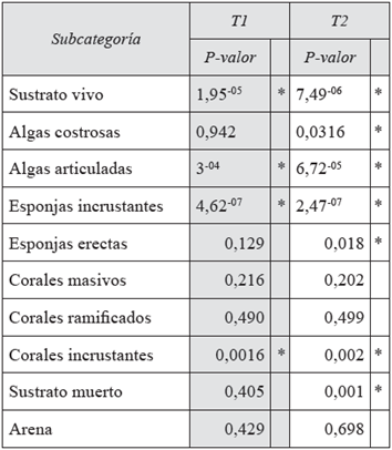 En la tabla 3 (T1) se aprecia la comparación de las coberturas de las categorías bénticas de ambos sitios al iniciar el estudio, donde no se hallaron diferencias en el sustrato muerto ni en arena (Kruskal Wallis, P=0,41, df=1 y Kruskal Wallis, P=0,43, df=1 respectivamente), pero sí para el resto de las categorías bénticas que, como se muestra en la tabla 4 (T1), fue mayor la cobertura viva en el sitio de control.