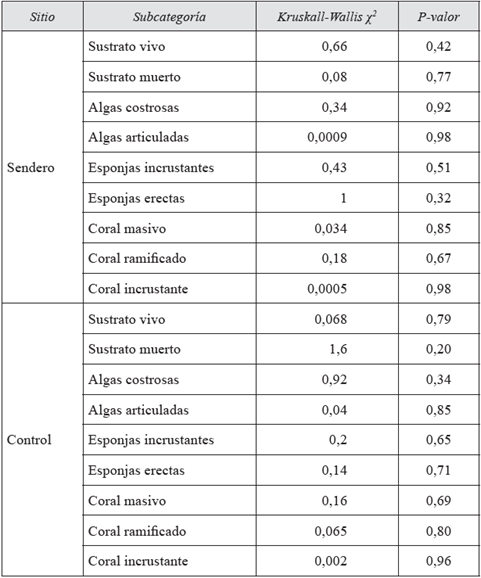 Para ello, se agruparon los componentes en categorías funcionales basadas en Acevedo-Valencia (2010) y Zakai y Chadwick-Furman (2002): corales (especies y formas de crecimiento) y zoantidos, esponjas, macroalgas y sustrato muerto. Estas categorías permiten describir a grandes rasgos los fondos en el sendero. De estas categorías se midió el área ocupada en los cuadrantes por medio del programa ImageJ ®, en el que, a partir de una escala definida del fotocuadrante1, es posible calcular la superficie de un área delineada, en este caso, cada categoría de la cobertura. Con los datos de área se calcularon las proporciones de cobertura para cada una de las categorías, con las que se realizaron pruebas no paramétricas de Kruskal-Wallis en el programa R ® para describir la variación en función de los dos momentos y sitios de muestreo de las categorías y subcategorías.