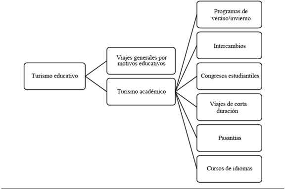 El turismo académico forma parte del turismo educativo, el cual se refiere a las actividades turísticas de las personas que realizan un viaje cuyas motivaciones, primarias o secundarias, son la educación y el aprendizaje (Ritchie, 2003). Ritchie clasifica el turismo educativo en dos segmentos principales: el eduturismo (o viajes generales por motivos educativos) y el turismo académico. Los viajes por motivos educativos son aquellos realizados generalmente por adultos y/o adultos mayores, en los cuales la obtención de conocimiento y el aprendizaje son su motivación y una parte importante de la experiencia turística. El turismo académico se refiere a los viajes de una duración inferior a un año, realizados por estudiantes en centros de educación superior fuera de su lugar de origen (ver también Pawlowska, 2011). En el turismo académico, la importancia de la experiencia turística es secundaria a la experiencia académica. Las formas de turismo académico más comunes son los programas de verano o invierno, los intercambios nacionales e internacionales, los congresos estudiantiles, los viajes de corta duración y las pasantías (figura 1). El enfoque de esta investigación son los alumnos de educación superior que realizan intercambios académicos fuera de su país de origen por un período inferior a un año.