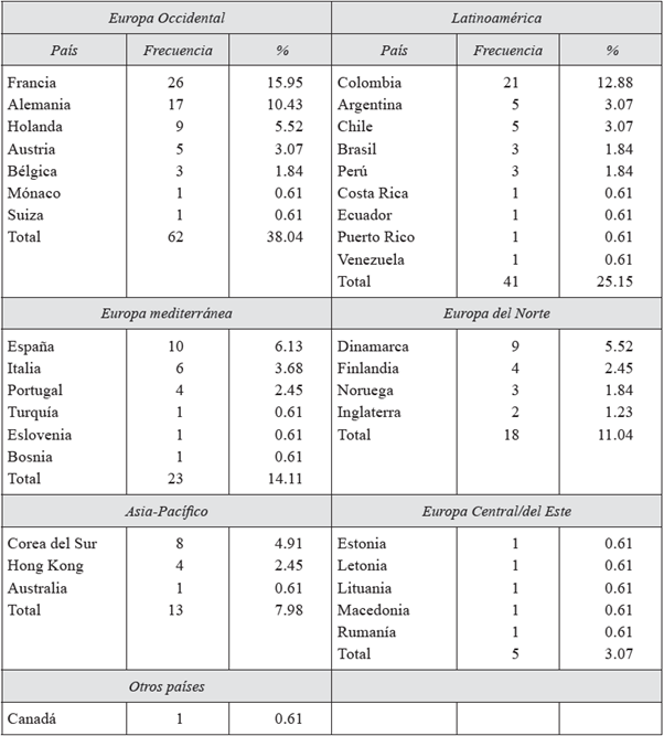 Ciento sesenta y tres estudiantes internacionales de 35 países participaron en el estudio, de los cuales el 60.1 % realizaron su intercambio en la UDEM, el 34.3 % en el ITESM y el 5.5 % en la UANL. Un poco más de la mitad (52.1 %) son de sexo masculino. El 66.3 % de los estudiantes provenían de países de Europa: los principales países emisores fueron Francia (24.1 °% del total de los estudiantes) y Alemania (15.7 %). Los estudiantes latinoamericanos representaron el 25.2 % de la muestra, con Colombia como el principal país emisor de esta región. Estudiantes de Corea del Sur y Hong Kong fueron los únicos estudiantes del continente asiático (7.4 %), mientras que el porcentaje restante (1.2 %) estuvo compuesto por estudiantes de países de habla inglesa, como Canadá y Australia. Para un análisis más profundo del segmento, las nacionalidades de los participantes se agruparon en seis regiones geográficas: Europa Occidental, Europa mediterránea, Europa del Este, Europa del Norte, Latinoamérica y el Caribe, y Asia-Pacífico (tabla 1). El área de estudios de negocios y ciencias administrativas fue la más común entre los estudiantes internacionales en Monterrey (46.6 %), en particular entre los de la UDEM y el ITESM; la mayoría de los estudiantes de la UANL (55.6 %) estudiaban carreras relacionadas con ciencias de la salud.