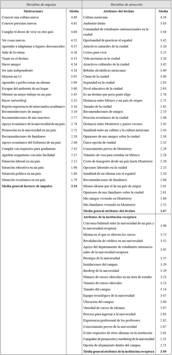 El segundo y tercer objetivos de la investigación fueron determinar las variables de impulso y atracción más importantes en la elección de Monterrey como destino académico. Los resultados indican que los estudiantes internacionales toman la decisión de realizar un intercambio con base en sus necesidades y deseos personales, por encima de cualquier situación externa a ellos. Las motivaciones personales relacionadas con conocer cosas nuevas y autodesarrollo fueron las más importantes para los estudiantes internacionales en Monterrey; las cinco motivaciones más importantes fueron "conocer una cultura nueva" (= 4.69), "conocer personas nuevas" (