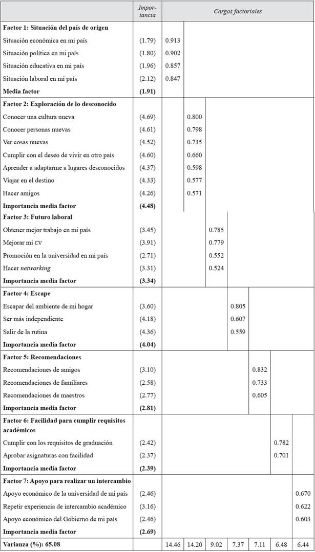 Con una medida de adecuación KaiserMeyer-Olkin (KMO) de 0.792 y prueba de esfericidad de Barlett significativa (2010.656; p: 0.000), 26 motivaciones para realizar un intercambio internacional resultaron en siete factores que explican el 65.08 % de la varianza de todas las variables. Se eliminó la variable "aprender o perfeccionar un idioma", ya que obtuvo una carga factorial inferior a 0.40. El primer factor, situación del país de origen, agrupa las motivaciones de viajar que genera la situación económica, política, educativa y laboral del país de origen del estudiante.