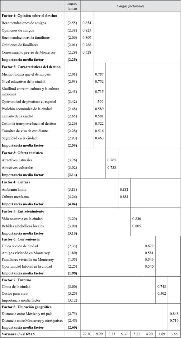 Los atributos del destino se agrupan en ocho factores que explican el 69.1 % de la varianza total (KMO: 0.826; prueba de esfericidad de Barlett: 27.65.32; p: 0.000). De las 31 variables iniciales se eliminaron dos: "comunidad de estudiantes internacionales en la ciudad", por tener una carga factorial menor a 0.40, y "similitud de mi idioma con el local (español)", por tener cargas factoriales cruzadas.
