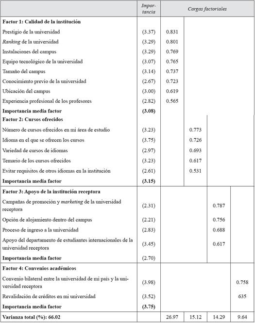Finalmente, los 19 atributos de la institución receptora se agrupan en cuatro factores que los estudiantes tomaron en cuenta al momento de realizar un intercambio académico internacional (KMO: 0.868; prueba de esfericidad de Barlett: 2030.08; p: 0.000) y que explican el 66.02 % de la varianza total: calidad de la institución, en aspectos tangibles del campus e intangibles, como el prestigio y el posicionamiento académicos; cursos ofrecidos; apoyo de la institución receptora; y convenios académicos, o la relación existente entre la universidad en casa y la del destino para facilitar el intercambio y revalidar créditos académicos.