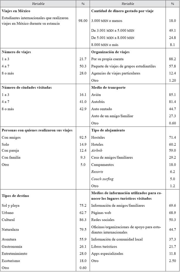 La gran mayoría de los estudiantes organizó sus propios viajes (88.20 %) y casi la mitad (57.8 %) también participó en viajes organizados por grupos estudiantiles; solo el 12.4 % de los estudiantes reportaron haber utilizado agencias de viajes para organizar algún recorrido en México. Las recomendaciones de amigos y familiares (69.6 %), las páginas web (68.9 %), las redes sociales (50.3 %) y las oficinas y organizaciones de apoyo a estudiantes internacionales (44.7 %) fueron las principales fuentes para obtener información sobre un destino. En cuanto al comportamiento de viaje, la gran mayoría de los estudiantes internacionales viajaron principalmente con amigos (92.5 %), mientras que el resto lo hicieron solos (14.9 %), con su pareja (12.40 %) o con familiares (9.30 %). Los medios de transporte más utilizados para viajar por México fueron el avión (85.1 %) y el autobús (81.4 %%). Los tipos de alojamiento preferidos fueron los hostales (71.4 %), los hoteles (60.2 %%) y Airbnb (59 %). Por último, el 18 % de los estudiantes que participaron en esta investigación gastaron menos de MXN 3.000 (USD 168) por viaje realizado durante su estancia en México; 49.1% tuvieron un gasto por viaje entre MXN 3.001 y MXN 5.000 (USD 168 y USD 280); 24.8 % gastaron entre MXN 5.001 y MXN 8.000 (USD 280 y USD 450) y solo el 8.1 % gastaron más de MXN 8.000 (USD 450) por viaje realizado.
