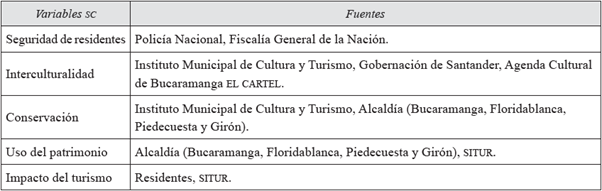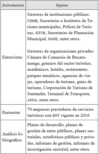 El proceso interpretó los resultados obtenidos por medio de instrumentos aplicados en el transcurso del año 2016 a un conjunto de prestadores de servicios turísticos (Cámara de Comercio de Bucaramanga (CCB), 2016) del Área Metropolitana de Bucaramanga que estaban activos en el Registro Nacional de Turismo y a personas directamente relacionadas con la gestión pública y privada de los diferentes ámbitos de los que se ocupan los indicadores contenidos en las plataformas del Sistema de Indicadores de Competitividad del Minen (MinCIT, 2008).