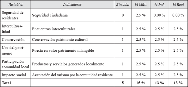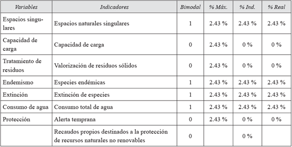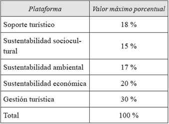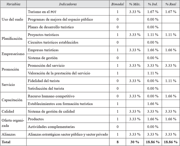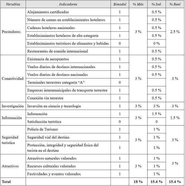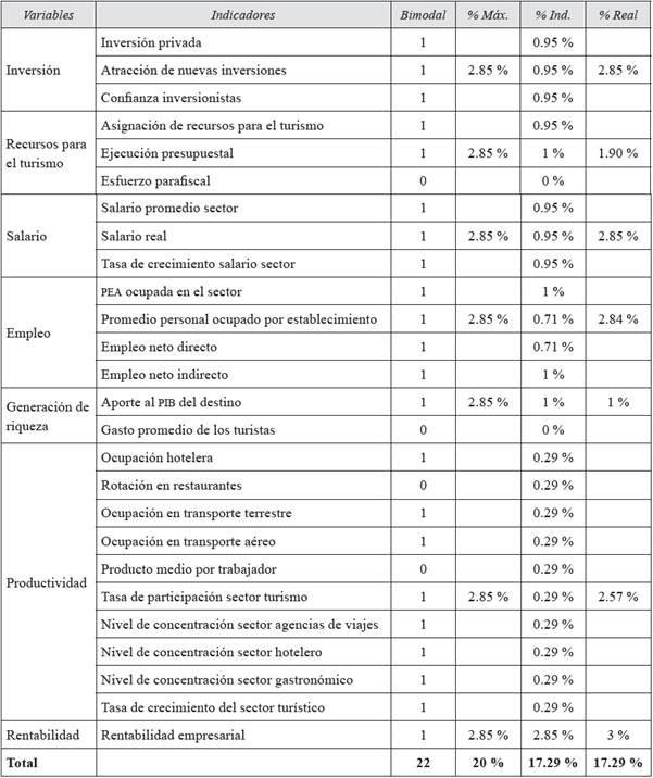 Para facilitar la valoración de las plataformas que componen el Sistema de Indicadores, el MinCIT las clasifica en variables, indicadores e índices. La metodología del MinCIT otorga un valor específico a cada una de las cinco plataformas. Los índices se transforman en variables bimodales1, donde "1" significa que la realidad que mide el indicador es verificable en el destino y "0" significa que no se verifica la realidad que mide el indicador o que es imposible hacer la verificación (MinCIT, 2008). En aras de la exactitud y la claridad de la medición, la variable bimodal no permite graduación alguna intermedia entre "0" y " 1".
