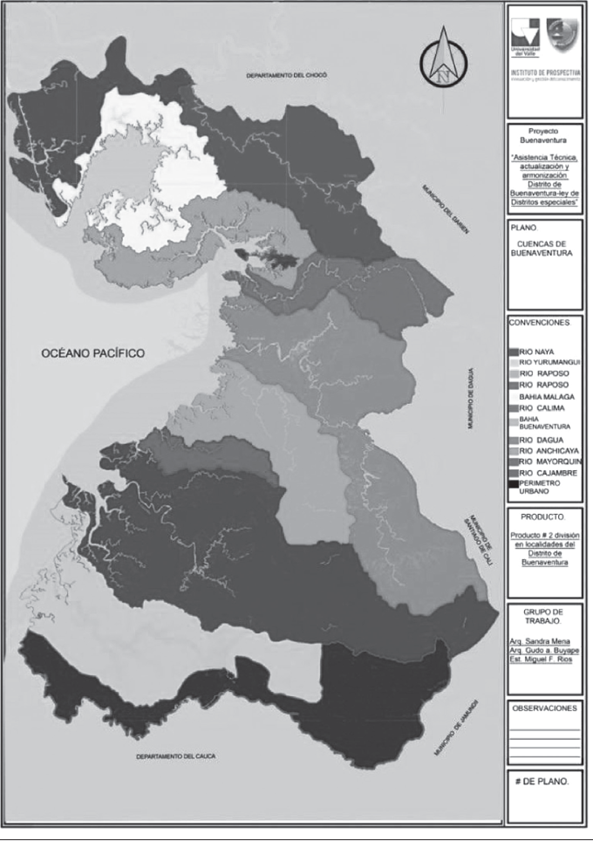 "Buenaventura es un puerto de rada abierta, con protección natural dentro de una bahía interior abrigada" (Alcaldía Distrital de Buenaventura, 2016). El Distrito se encuentra localizado en el centro-sur de la región Pacífica de Colombia o Chocó biogeográfico, región que es considerada como una de las de mayor biodiversidad en el mundo (figura 1). Esta ubicación hace que Buenaventura posea múltiples potencialidades naturales, entre las que se encuentran ecosistemas como el marino costero, manglar, natal, guandal, selva pluvial, bosque premontano, bosque andino y páramos. El territorio distrital es el de mayor extensión en el departamento de Valle del Cauca, con un área de 6.297 km2 o 629.700 ha (29.7 % del área total del departamento). Su territorio abarca todos los pisos térmicos, desde el litoral hasta los inicios del páramo en la cordillera occidental, y su zona urbana tiene tan solo un área de 2.160,9 ha. "Limita por el norte con el departamento del Chocó; por el oriente, con los municipios de Jamundí, Cali, Dagua y Calima Darién; por el sur, con el departamento del Cauca; y por el occidente, con el océano Pacífico" (Alcaldía Distrital de Buenaventura, 2001). Este territorio biodiverso comprende once cuencas hidrográficas, las cuales son bahía de Buenaventura, bahía Málaga, río Anchicayá, río Cajambre, río Dagua, río Mayorquín, río Naya, río Raposo, río San Juan y río Yurumanguí (ver figura 1).