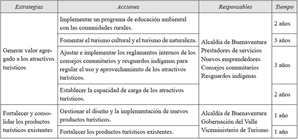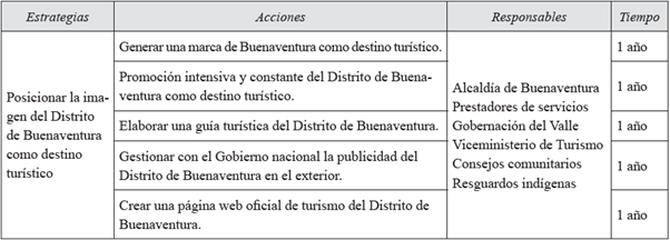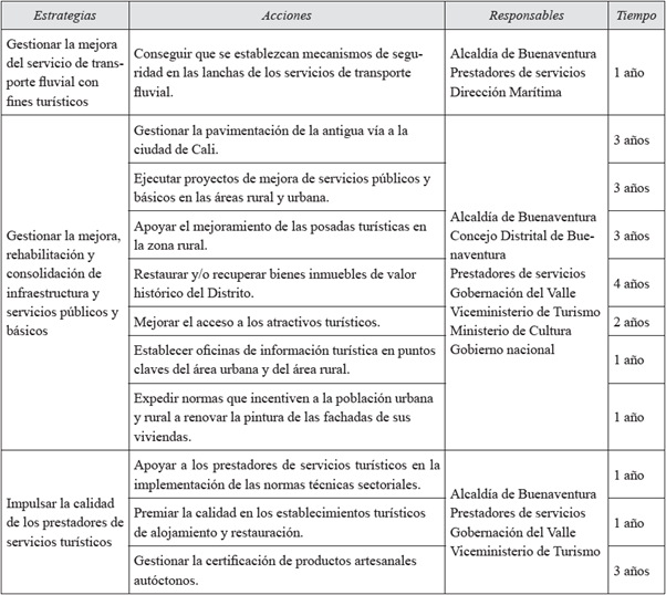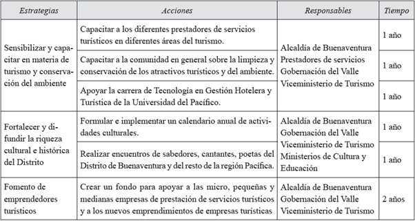 De acuerdo con los atractivos turísticos identificados, Buenaventura tiene potencial para mejorar la diversidad, la cantidad y la calidad de las zonas turísticas que se visitan, razón por la cual se proponen unos lineamientos estratégicos para gestionar el turismo en el Distrito (ver tablas 10, 11, 12 y 13). Estos lineamientos constan de áreas de acción, estrategias, acciones, responsables y tiempo.