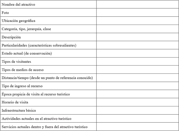 Para la realización del inventario, se diseñaron fichas en las que se registraron los datos del atractivo (anexo 1). Para lo anterior, se utilizó la técnica de la observación, la cual, según Hurtado (2000 y 2002), "constituye un proceso de atención, recopilación, selección y registro de información, para el cual el investigador se apoya en sus sentidos, vista, oído, olfato, tacto, etc.". La técnica de la observación se abordó desde la no participante, que es cuando el observador permanece ajeno al evento que se va a estudiar, no participa en él ni lo modifica, e intenta mantener su propio marco de referencia intacto, sin dejarse afectar por las percepciones de las personas a quienes observa. Esta observación no participante fue no estructurada, por lo tanto, consistió en recoger y anotar los hechos sin ayuda de medios técnicos especiales.