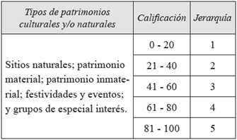 Para complementar la valoración de los atractivos culturales y/o naturales presentados anteriormente, en la tabla 3 se establecen cinco jerarquías en las que se pueden categorizar.