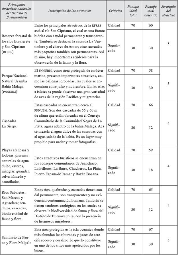 De acuerdo con los resultados, se evidencia que el Distrito de Buenaventura cuenta con importantes atractivos naturales que pueden motivar la visita de turistas nacionales y extranjeros, hasta tal punto que tres de ellos están en la máxima jerarquía establecida y los otros tres se ubican en la jerarquía 4, que también es relevante para un atractivo turístico. Es importante destacar que, en la medida en que los atractivos naturales mantengan una buena calidad -es decir, con bajos niveles de contaminación del aire, del agua, visual, sonora-, conservarán o mejorarán la jerarquía que presentan.