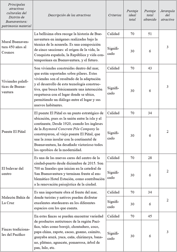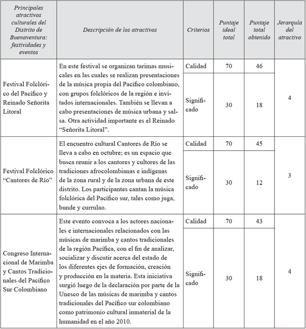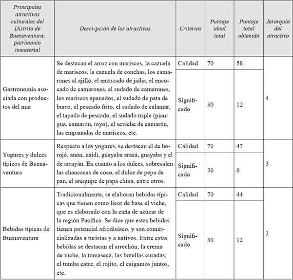 De acuerdo con la jerarquía de los atractivos (tabla 6), a excepción de la gastronomía asociada con productos del mar, el patrimonio inmaterial del Distrito de Buenaventura presenta un reconocimiento a nivel local, departamental y regional. La calidad de estos atractivos debe ser mejorada, dado que ninguno de ellos está cerca de alcanzar la calidad máxima.