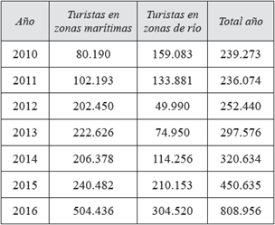 De acuerdo con la Alcaldía Distrital de Buenaventura (2017), el promedio de turistas que visitan el Distrito ha venido aumentando en los últimos años, siendo las zonas marítimas más visitadas que las zonas de los ríos, como se presenta en la tabla 8.