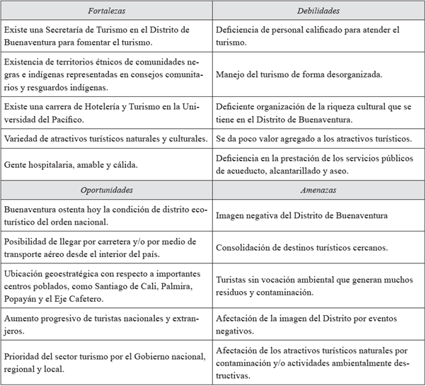 Las principales fortalezas, debilidades, oportunidades y amenazas del turismo en el Distrito de Buenaventura se resumen en la tabla 9.