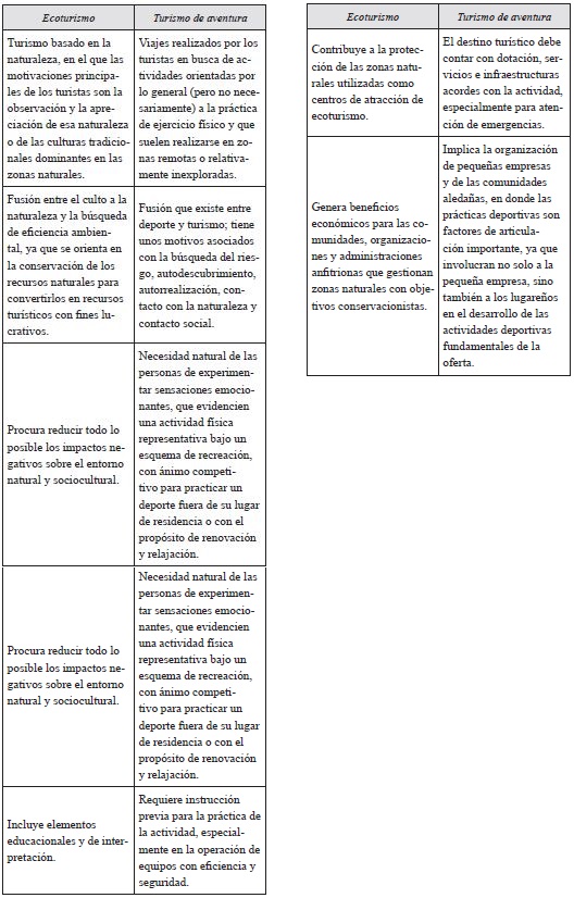 Para un mejor entendimiento de las dos líneas de producto turístico analizadas, se presenta a continuación un cuadro comparativo del ecoturismo y el turismo de aventura con base en lo planteado por los autores antes mencionados y por la Organización Mundial de Turismo.
