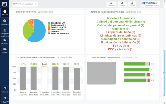 Finalmente, Revinate se dedica a capturar, medir y optimizar la experiencia de los huéspedes combinando todas las reseñas en línea y menciones en redes sociales en una única visión integrada. Tiene más de 28.000 clientes en 160 países y permite observar las opiniones del hotel y de su competencia (Revinate, 2016). Revinate es el software que se utilizó para realizar la presente investigación, dado que es el programa utilizado por la cadena hotelera GHL para medir su reputación en línea. Este programa también permite hacer un análisis semántico clasificando los comentarios por tema, departamento, calificación, período o canal (OTA, sitio de opinión o red social), como se puede observar en la figura 1.