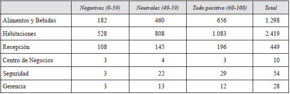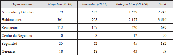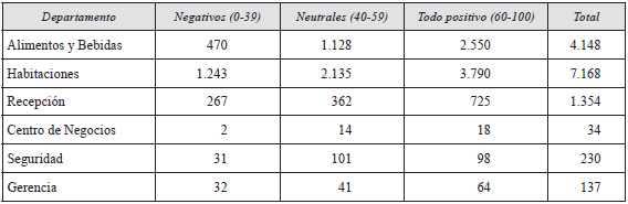 En la tabla 2 se presenta el número total de comentarios analizados por los departamentos definidos. Los comentarios fueron clasificados en negativos, neutrales y positivos.