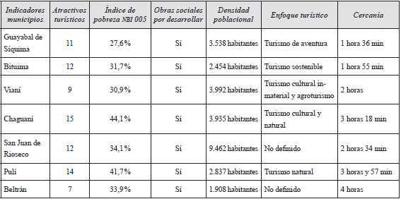 Visto esto, se creó la siguiente tabla teniendo en cuenta las características dadas para el desarrollo del turismo y se preseleccionaron tres municipios, teniendo así una mayor cobertura de la comunidad receptora.