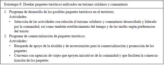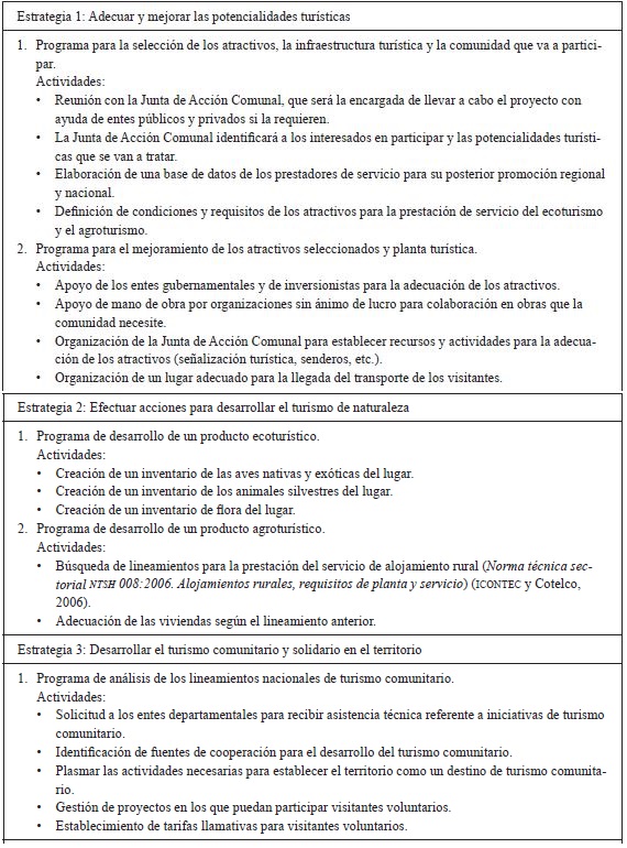 Es por esto que bajo la propuesta de los subproductos se estableció un ejemplo de paquete turístico como primer paso para la generación del turismo, para que, por medio de la recopilación realizada, la comunidad tuviera una idea de qué atractivos están disponibles para un visitante. Para llevar a cabo la difusión y el reconocimiento de los subproductos y el paquete turístico, se plantearon diferentes estrategias y programas que al desarrollarse con éxito permitirán que el trabajo sea llevado a cabo en otros municipios de Colombia y generar así alternativas sustentables que superen los altos índices NBI.