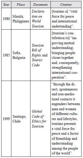 La OMT (2001) incluye en su discurso la relación de turismo y paz desde 1980, en la llamada Declaración de Manila, surgida de una asamblea con la participación de 107 delegaciones de Estados y 91 delegaciones de observadores, reunida con el fin de aclarar la naturaleza del turismo en todos sus aspectos y el rol que está llamado a jugar en la dinámica de cambio del mundo. El resultado de la Declaración se resume en el siguiente enunciado: "Convencidos de que el turismo en el mundo puede ser una fuerza vital para la consecución de la paz mundial y capaz de proveer las bases morales e intelectuales para el entendimiento y la interdependencia internacional" (D'Amore, 2014, p. 356). Salazar (2006b) identifica, además de la Declaración mencionada, las primeras iniciativas de este organismo internacional sobre turismo y paz, como se muestra en la tabla 1.