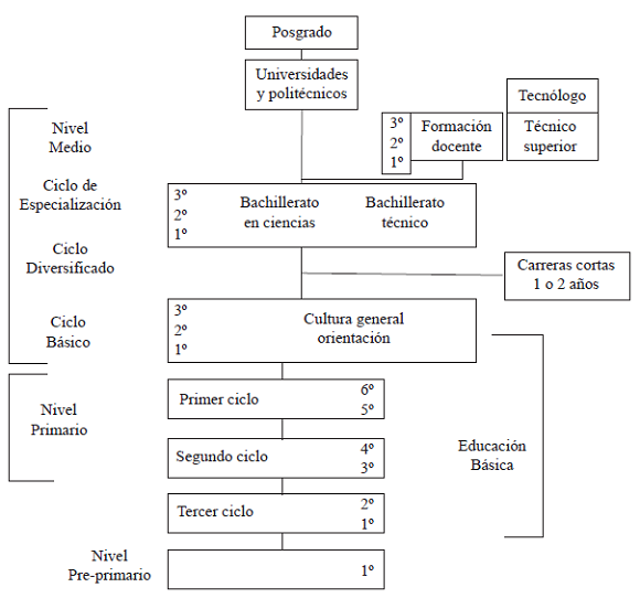 Los principios fundamentales del sistema educativo de Ecuador se declaran explícitamente en tres documentos básicos: la nueva Constitución de la República, que fue aprobada en julio de 2008; la Ley de Educación y Cultura, de 1983; y la Ley Profesor de Carrera y Escalafón del Magisterio Nacional, de 1990 (OEI, 2015). El sistema educativo del país se compone de los siguientes ciclos (OEI, 2015, s. p.):