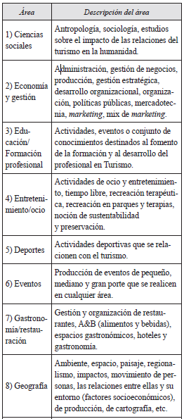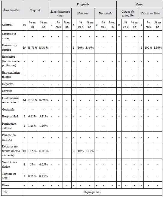 Las temáticas de (1) economía y gestión, (2) gastronomía y (3) hospitalidad forman el centro de la OET, considerando los niveles y tipos analizados, y concentran más del 85 % de toda la oferta existente. El lapso de una OET más plural, particularmente considerando las áreas transversales (ciencias sociales, entretenimiento/ocio, formación en turismo, geografía) en los niveles de pregrado y posgrado, es considerado un elemento que parcialmente dificulta el establecimiento de estructuras formales de investigación en turismo, pues se caracterizan como disciplinas pragmáticas y que demandan la priorización de actividades prácticas en su proceso formativo.