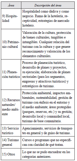 • Énfasis. Se buscó identificar la existencia o no de énfasis de los cursos en áreas específicas del turismo de acuerdo con la muestra del estudio, fundamentado por las áreas que definen específicamente el vínculo de la oferta educativa.