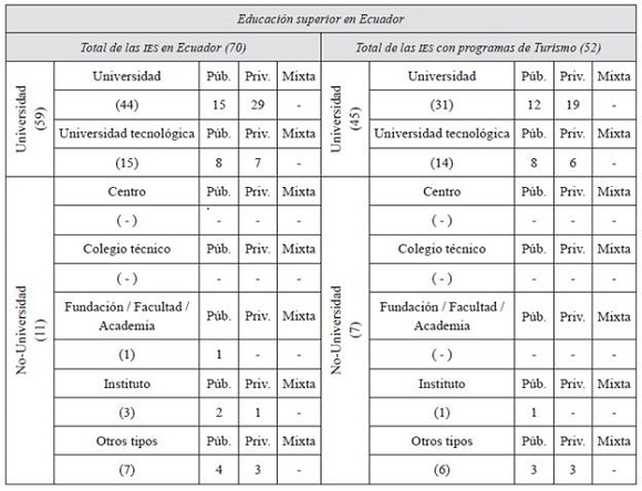 En Ecuador, la oferta educativa en turismo es significante en comparación con la oferta educativa total del país, es decir, 74.28 % de las IES del país presentan algún programa de formación en el área del turismo.