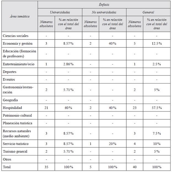 Si se considera la existencia de énfasis en los programas, 60 % del total de los énfasis conduce al área temática de la hospitalidad; le siguen economía y gestión, servicios turísticos y recursos naturales (medio ambiente), cada uno con una tasa de 8.57 %. En total, estos 4 énfasis juntos suman el 85 % del total identificado en esta categoría.
