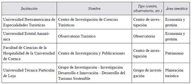 En la muestra de 52 IES con oferta educacional relacionada con turismo, se identificó la existencia de 4 estructuras de investigación tipo centro de investigación y 1 observatorio de turismo, dedicados al estudio del turismo en el área temática de economía y gestión; 1 centro de investigación dedicado al área temática de patrimonio y 1 grupo de investigación que estudia el tema de la planeación turística (tabla 5).